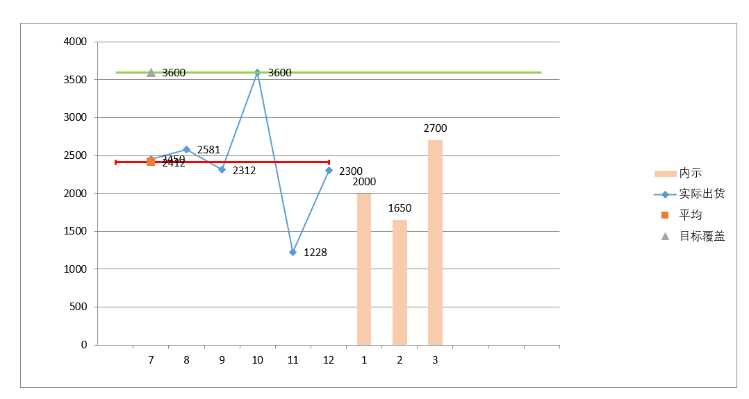 大鹏制定的新订货策略是以过去历史数据为基础,当设立值为1的服务目标水平时,意味着他挑选出过去六个月的实际出货数据中最高数据那个,即10月的实际需求3600, 以此为基准乘以1,并希望3月份的库存量都能够达到这个基准线。