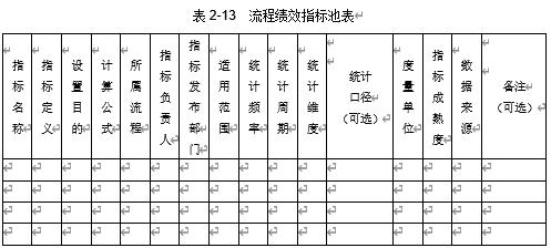 流程的梳理不是一蹴而就的,流程绩效指标的设计亦是如此,为了方便管理,通常会建立统一的流程绩效指标池。对于流程的新建、优化、变更、失效(或废止)等,都需要进行审视并更新对应的流程绩效指标库,尤其是流程绩效指标之间的关系网,包括纵向的分解与横向的拉通。流程绩效指标池表可以参考表 2-13的栏位设计。