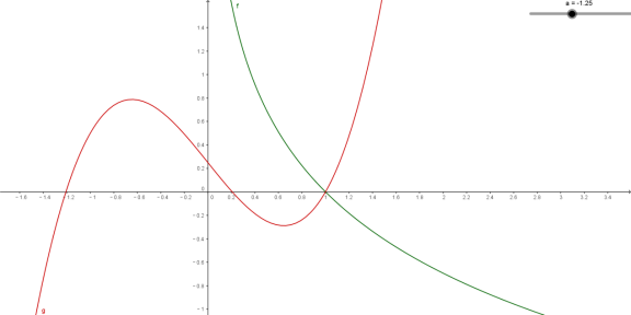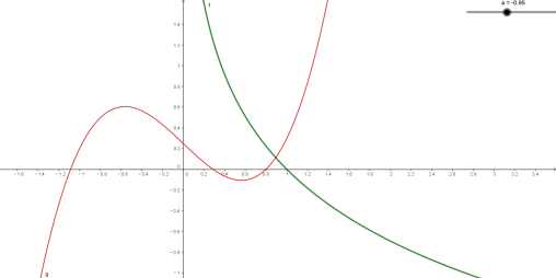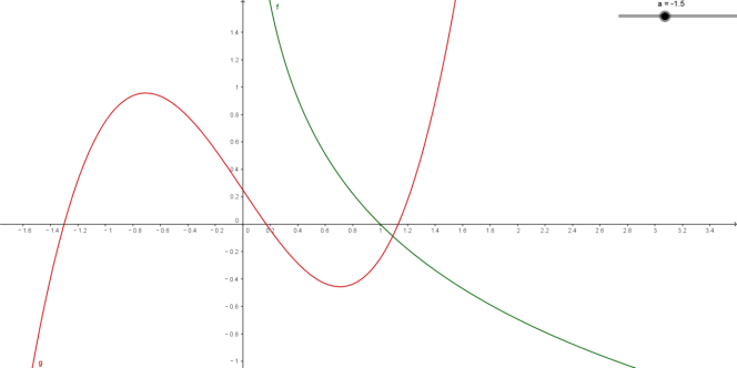 ,所以递增,在递减,是函数的极大值.但这时我们不能贸然就下结论:时,有两个交点,因为我们还需要考虑时函数的变化情况.由于现在施行的高中课标不讲极限,所以,我们要说明零点存在,就要根据存在性定理,具体找出一个,这就成为零点问题的难点.例如,本题需要说明下列两个问题: