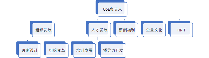 我们再来梳理CoE(Center of Expert),也叫专家中心或者HR专家,图3-2是专家团队比较典型的组织架构。根据前述,不是所有的公司都会设置CoE专家团队,因为有些组织可能很小,或者BP的专业能力强大,或者HR同外部咨询机构合作密切,这些情况下,CoE这个内部组织就没有存在的必要,只是工作被分离出去而已。