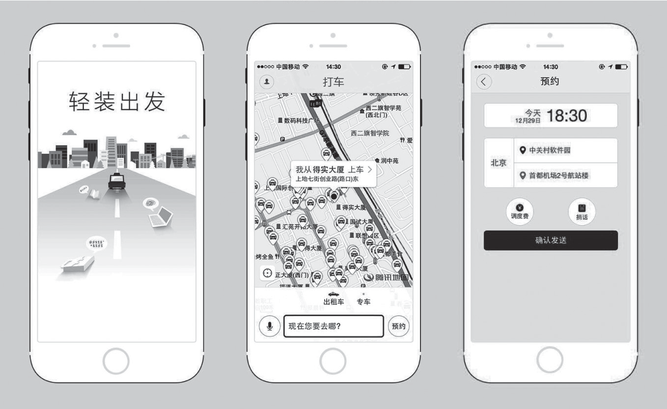 商业模式IT 化,与原型能力异曲同工。为了让读者清晰地了解原型能力的重要性, 先来解释一下什么是“商业模式 IT 化”。大家可以拿出自己的手机,随便打开一个非纯工具类的 APP,如滴滴出行,平台的商业模式就融合在 APP 软件中(图 3.4)。通过简单的分析,就可以得出滴滴的商业模式。