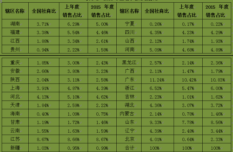 社会商品零售总额可以在国家统计网上查询到,它对零售型为主导的企业尤其有效。在实际应用中,社商比反映的是区域市场增长的潜力空间,销售额占反映的是区域市场的销售基础,充分考虑两者的因素,取两者平均值,2015年区域市场的销售占比也就基本成型(如表5-2所示)。