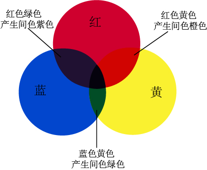 生活中,我们会看到不同色彩的物体,红色的毛衣、绿色的鞋子等,而这些色彩并不是物体本身所固有的,自然界中所有物体的颜色都是反射光波和吸收光波的结果。所有的颜色都由红黄蓝三种颜色组成,这三种颜色既相互独立又相互影响,互相混合能够产生不同的颜色,即红和黄混合得到间色橙色,黄和蓝混合形成间色绿色,红和蓝混合形成间色紫色,这些颜色再进行混合又能形成更多的颜色,因此红黄蓝三色也被称为色彩的三原色。如图8-1、图8-2所示。