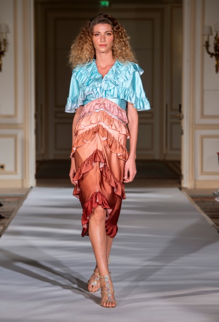 纯度:纯度也叫饱和度和彩度,指的是色彩的鲜艳程度,纯度越高,色彩越鲜艳,纯度越低,色彩越浑浊。最高纯度是没有其他色彩的纯色,随着纯度的降低,色彩就会越来越暗淡,最低纯度则是无彩色的灰色。高纯度的色彩给人华美、艳丽的视觉效果,能够使人兴奋;中纯度的色彩基调比较饱满、柔和,可以让人长时间的注视;而低纯度的色彩比较低调、耐看,可以使人产生更多的联想。不同纯度等级的服装搭配在一起,能够给人带来不同的视觉效果。纯度等级差小的颜色搭配时,如高纯度与高纯度的色彩相配鲜明,对比强烈,搭配时一定要注意技巧,比较适合运动装、童装等,如图8-9所示。中纯度与中纯度相配显得年轻,优雅如图8-10所示。而低纯度与低纯度搭配则显得淡雅、神秘,如图8-11所示。纯度等级差大的颜色搭配看起来清浊分明、对比鲜明、韵律感更强,如图8-12所示。