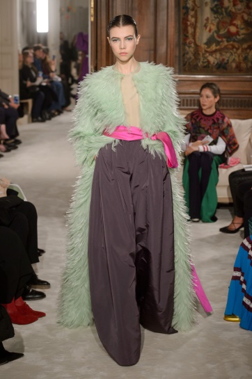 柔软与坚硬性:柔软与坚硬不一定需要通过面料的质感来表现,利用色彩也可以表现出这些性质。明度高且纯度低的色彩给人柔软柔和的感觉,低明度、低纯度色彩则表现出坚硬感。如图8-31、图8-32所示,同样材质的服装,暖色调给人柔和、柔软的感觉,而冷色调的蓝绿比较之下增加了几分坚硬感。
