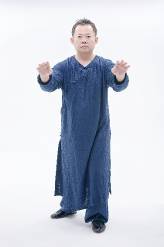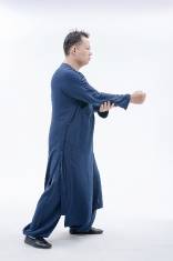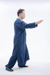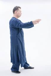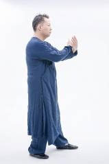 4.右脚踩下将重心平移至左脚心,两手臂松肩垂肘。随着重心逐渐移往左脚,夹脊吐炁,保持美人手,成按劲之准备动作。