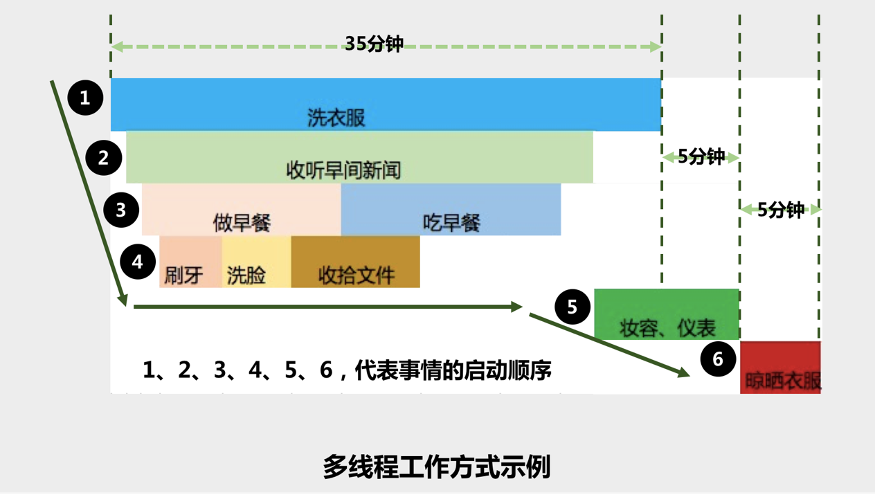 作者将多线程这一概念借用到时间管理中的意思是,在一个单位时间(即某一具体时段)内,将两项或者两项以上的工作并行开展,从而实现单位时间的效率、效益最大化——即多线程工作方式。