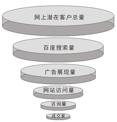 假如网上有1000个人(潜在客户量)对你的企业产品感兴趣,可能有500个人会通过百度搜索引擎去寻找供应商(搜索量),其中有200个人看到你的广告(广告展现量),其中有50个人点击了你的广告进入你的网站(网站访问量),然后有8个人对你网站上的介绍感兴趣并与你联系(咨询量),其中有1个人买了你的产品(成交量)。我们把这些量形成饼状图叠起来,就形成了一个漏斗状的结构(以百度搜索为例),如图1-13所示。