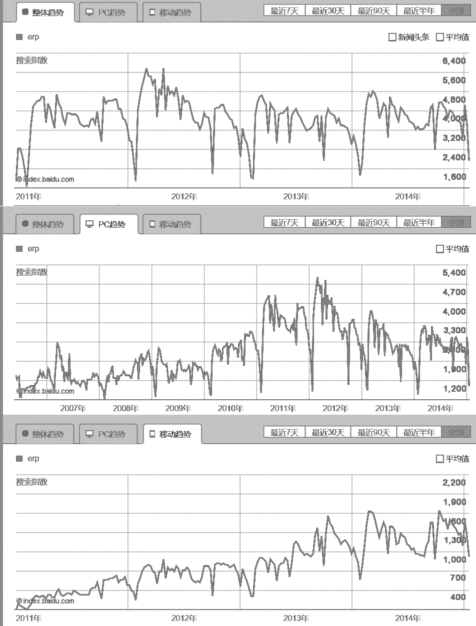 网络搜索量:网上潜在客户有多种选择去寻找卖家,本章第四节谈到网络营销的各种方法,其实也是客户找卖家的方法,由于本书重点是研究搜索引擎营销,所以在此我们是用搜索量来代替客户的需求量。某个行业的关键词在各搜索引擎(如百度、360等独立搜索引擎,阿里巴巴、淘宝、赶集网等内部搜索引擎等)被搜索的量,就能反映出整个行业的市场需求。企业很难左右市场需求,但可以利用一年中搜索量的变化,最大化地获取潜在客户,比如在需求旺季加大广告投放,还可以通过增加多个搜索引擎广告的投放来提高企业网站的搜索量。如图1-14所示,企业管理软件(ERP)行业近几年搜索“ERP”一词的搜索量。