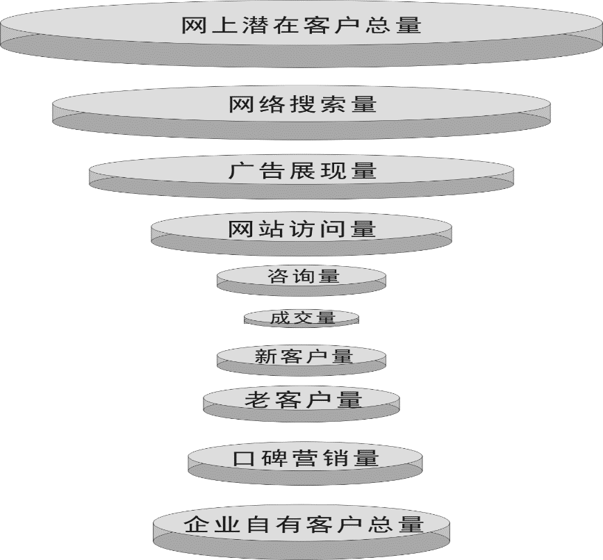 这个漏斗结构我们还可以倒过来看问题:假如一个企业的供货能力是个不变量,要想提高成交量,就必须提高网络的咨询量;要想提高咨询量,就要加大网站的访问量;要想加大访问量,就要提高网络广告的展现量;要想提高展现量,就要加大网络上的广告投入。不同于传统广告媒体,这种投入不单是广告费用的投入,还应当是人员、技术、设计、创意等方面的投入。