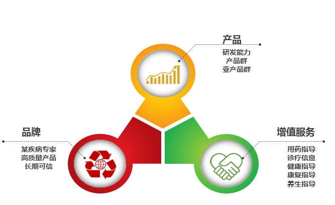在新竞争三角框架中,药企不再把自己当成简单的制造者,而是在维持较强的研发能力和自有产品群构建能力的前提下,从医药医疗健康等生态圈中获得更多的商业机会。这就有可能整合其他中小型制药企业、流通商业、药店终端甚至医疗终端,这种整合是轻资产式整合,其目的就是未来构建竞争壁垒,在有效的疾病领域形成庞大的强黏性的消费者群体。