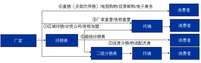 下图是中国市场分销渠道的五种类型:(1)厂家通过区域经销商实现终端覆盖(区域经销制);(2)厂家通过二级分销商实现终端覆盖(深度分销);(3)厂家直营方式实现终端覆盖(终端直营);(4)厂家直达消费者的销售形式(直销);(5)超级经销商实现的终端覆盖或直达消费者(大代理商制)。