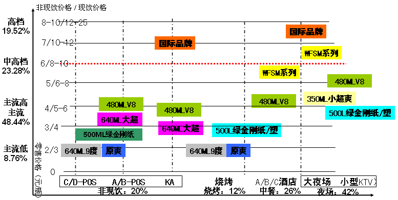 (1)非现饮:占总销量的20%,但企业在三类非现饮终端里,依据终端销售能力,分别投放了不同价位的产品组合,非现饮终端的产品与现饮终端具有一定的呼应,如C/D-POS与烧烤投放大众化(主流低)的640mL9度及原爽两个品种,A/B-POS、KA与A/B/C酒店投放的主流/主流高价格带品种相呼应。